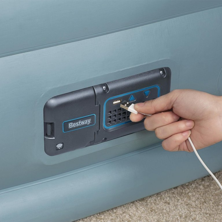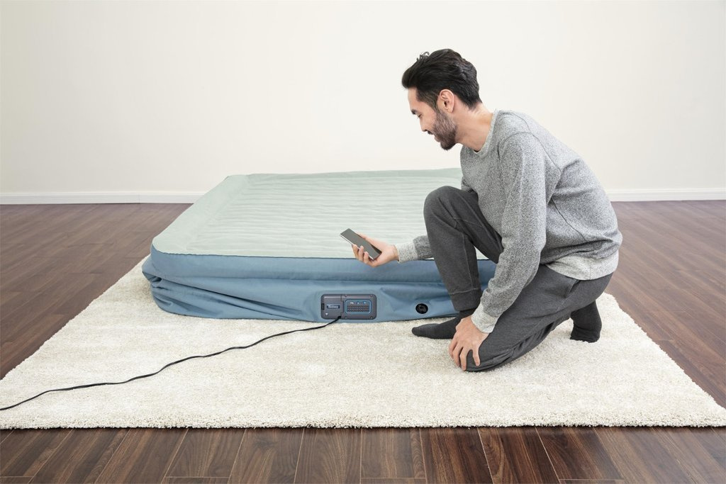 W części górnej materac został pokryty przyjemnym welurze w kolorze szarym. Dzięki zaworowi szybkiego spuszczania powietrza materac może być w łatwy i szybki sposób złożony, gdy nie będzie już potrzebny.